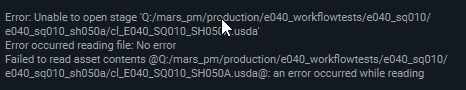 Может возникнуть при работе с usd в ASCII-формате. Необходимо проверить размер файла. Если он составляет больше 1073 Мб (ограничение на размер), сохранить этот файл в бинарном формате.